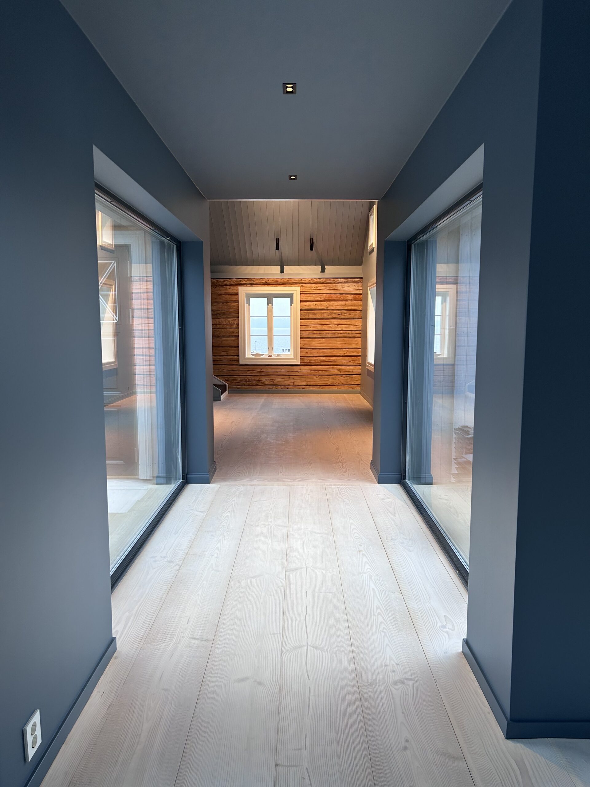 Moderne renovering av hytte med dype blågrå vegger og tak, som skaper en intim og stemningsfull atmosfære. Den hvite eikeparketten lyser opp rommet og balanserer de mørke fargene. Eksponert treverk i bakgrunnsrommet gir en autentisk hyttefølelse.